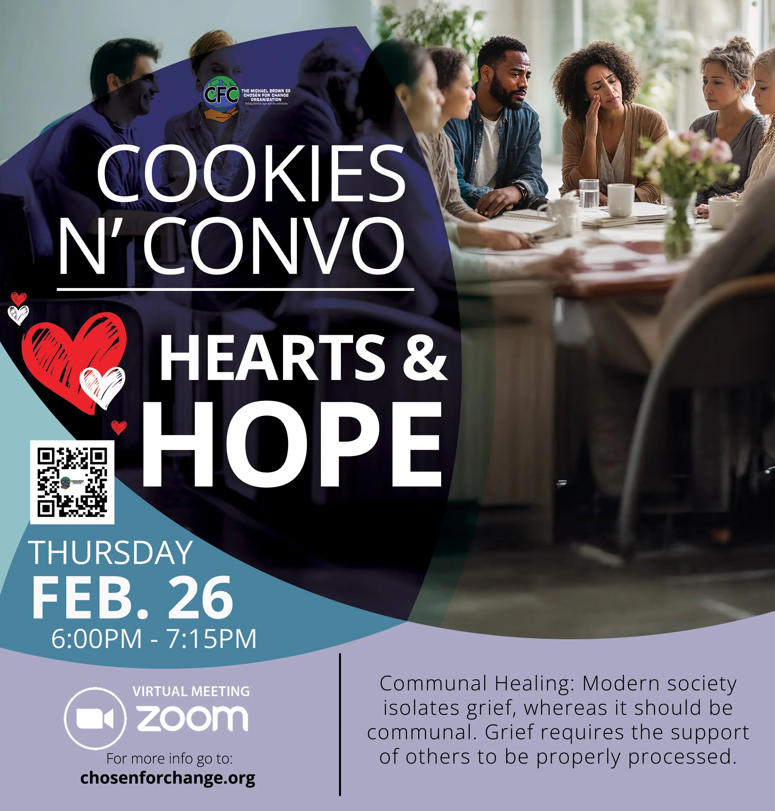 Register today and join us Feb 26 for Cookies N Convo as we discuss how modern society isolates grief, whereas it should be communal. This experience will be held virtually on Zoom